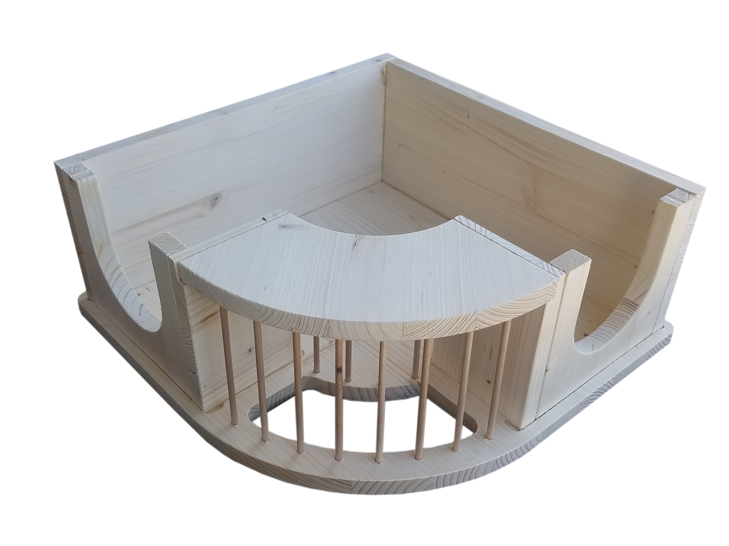 Variabel einsetzbare, an Häuschen anstellbare oder vielfach mit der Wutzenburg kombinierbare Rampe. Die Rampe ist mit einer Steigung von 22,5° sehr bequem für Meerschweinchen zu begehen, die Brüstung zu beiden Seiten bietet auch unsicheren und älteren Tieren viel Sicherheit. Für rutschsicheres Gehen ist die Rampe mit Kork beschichtet. Sie ist an der Vorderseite offen und hat zu beiden Seiten je einen Durchschlupf, so dass sie neben der Funktion als Rampe auch noch eine Versteckmöglichkeit mit mehreren Eingängen bietet, selbst wenn die Rampe an eine Häuschenseite ohne Eingang gestellt wird. Aus naturbelassenem Nadelleimholz. Hergestellt in Deutschland. Maße: ca. (LxBxH) 385x180x230 mm, Höhenabschluss der Lauffläche bei ca. 155mm,   Durchmesser Durchschlupf 110mm Lieferung ohne Meerschweinchen und Deko.