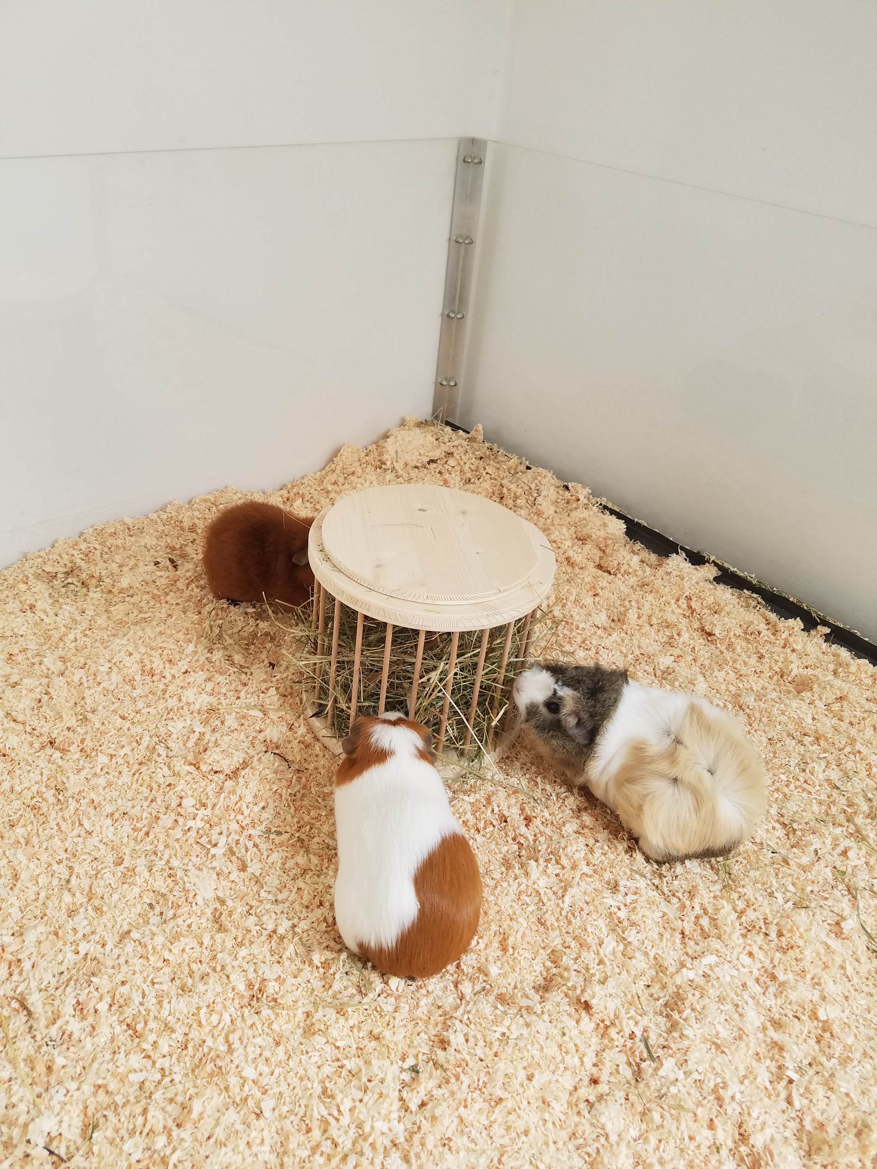Sehr große runde, frei stehende Heuraufe, ideal für große Meerschweinchengruppen oder auch Kaninchen. So können mehrere Tiere ungestört miteinander fressen. Sehr großes Fassungsvermögen. Einfach von oben zu befüllen. Aus Nadelleimholz, hergestellt in Deutschland.