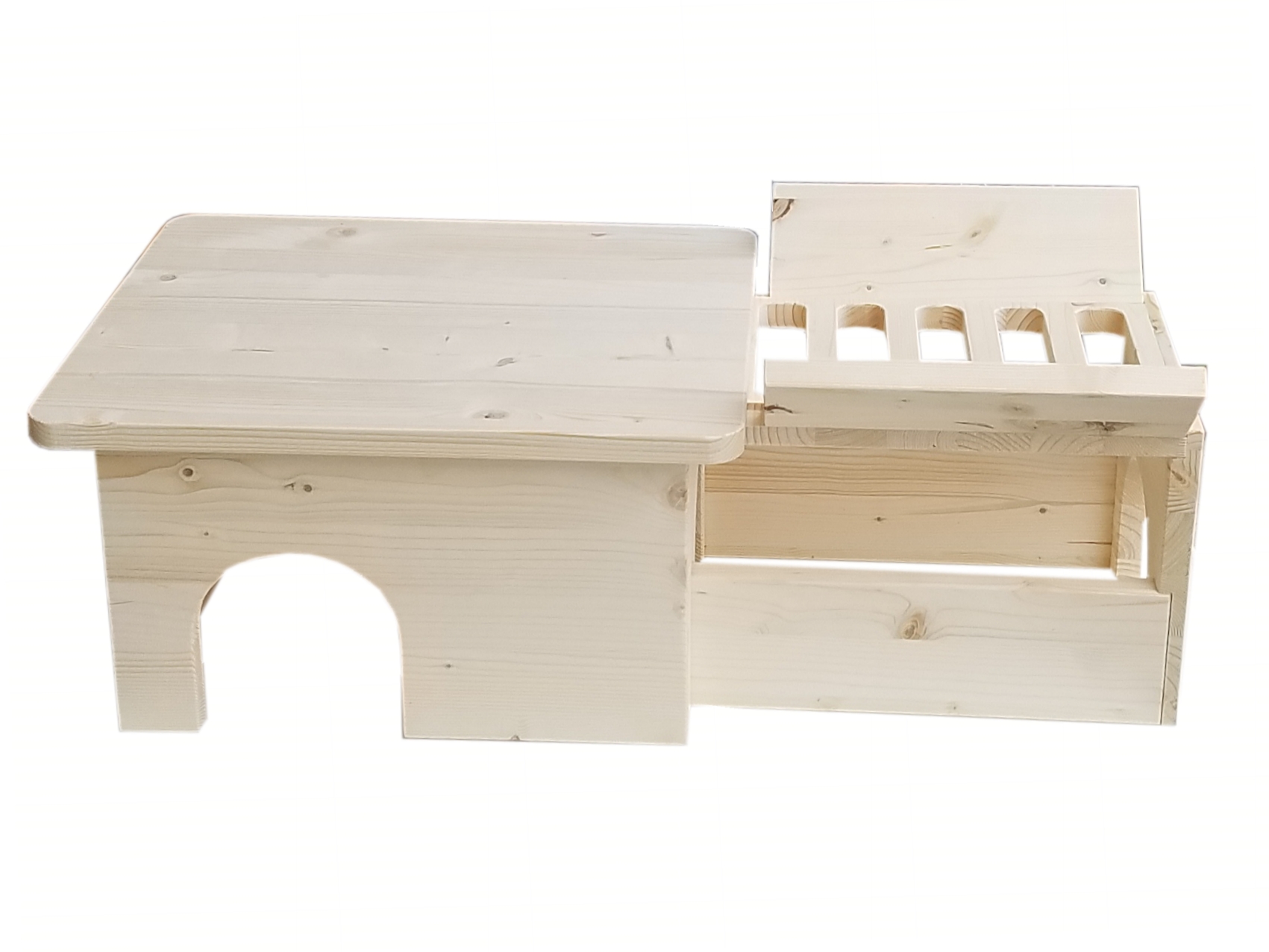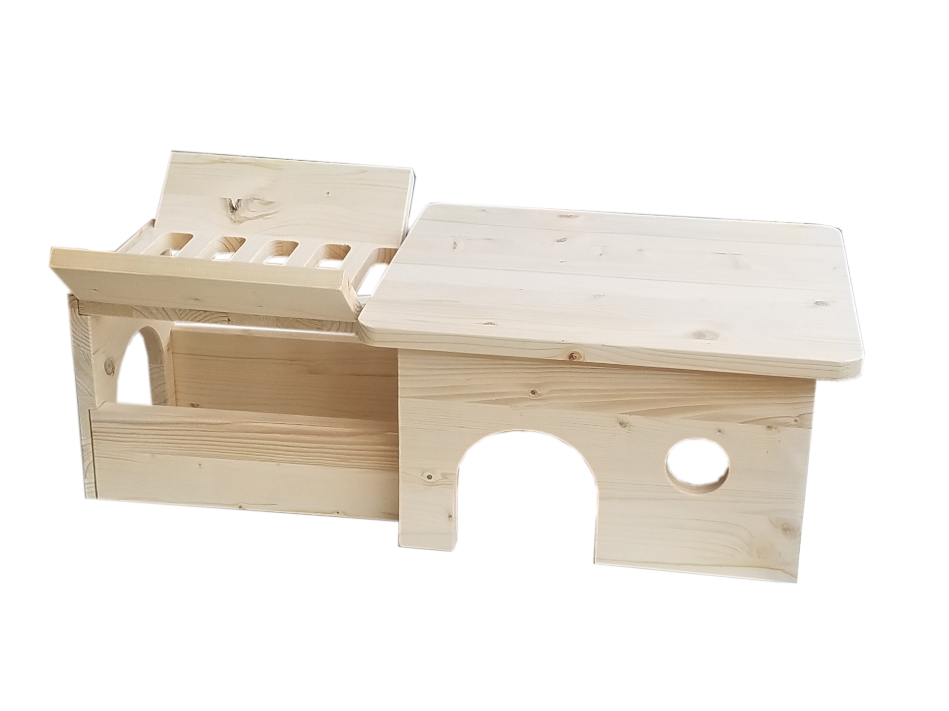 Dieses große Häuschen hat drei Aus- und Eingänge, ein Fenster und einen Durchgang unter der sehr geräumigen Heuraufe, die mehreren Schweinchen genügend Platz zum Fressen bietet. Gefertigt aus naturbelassenem Nadelleimholz, hergestellt in Deutschland.