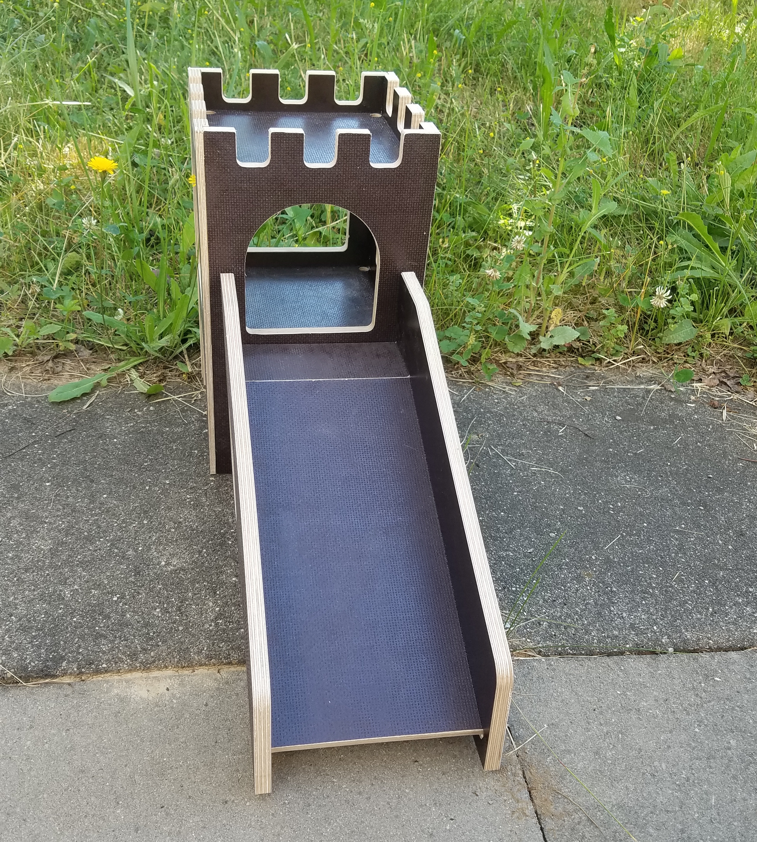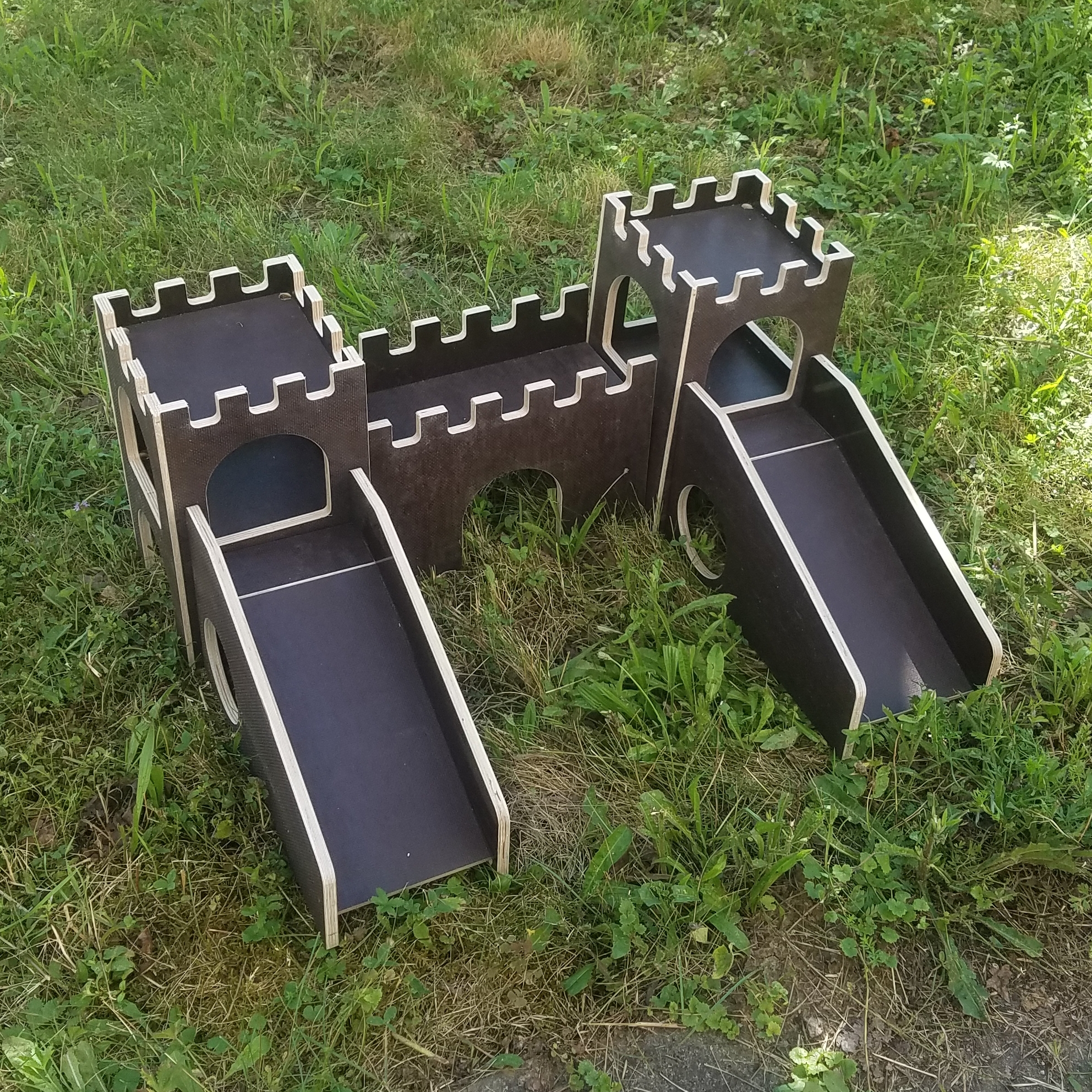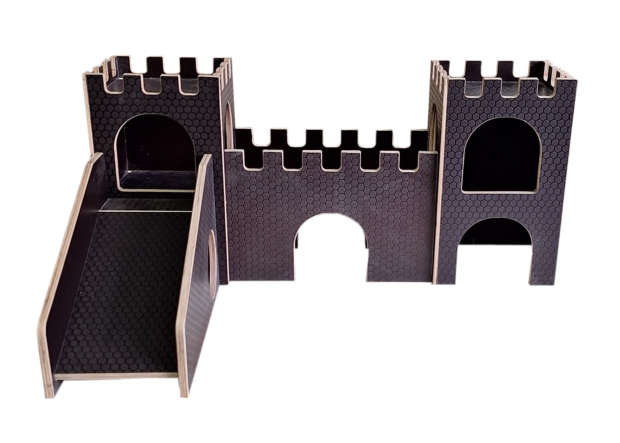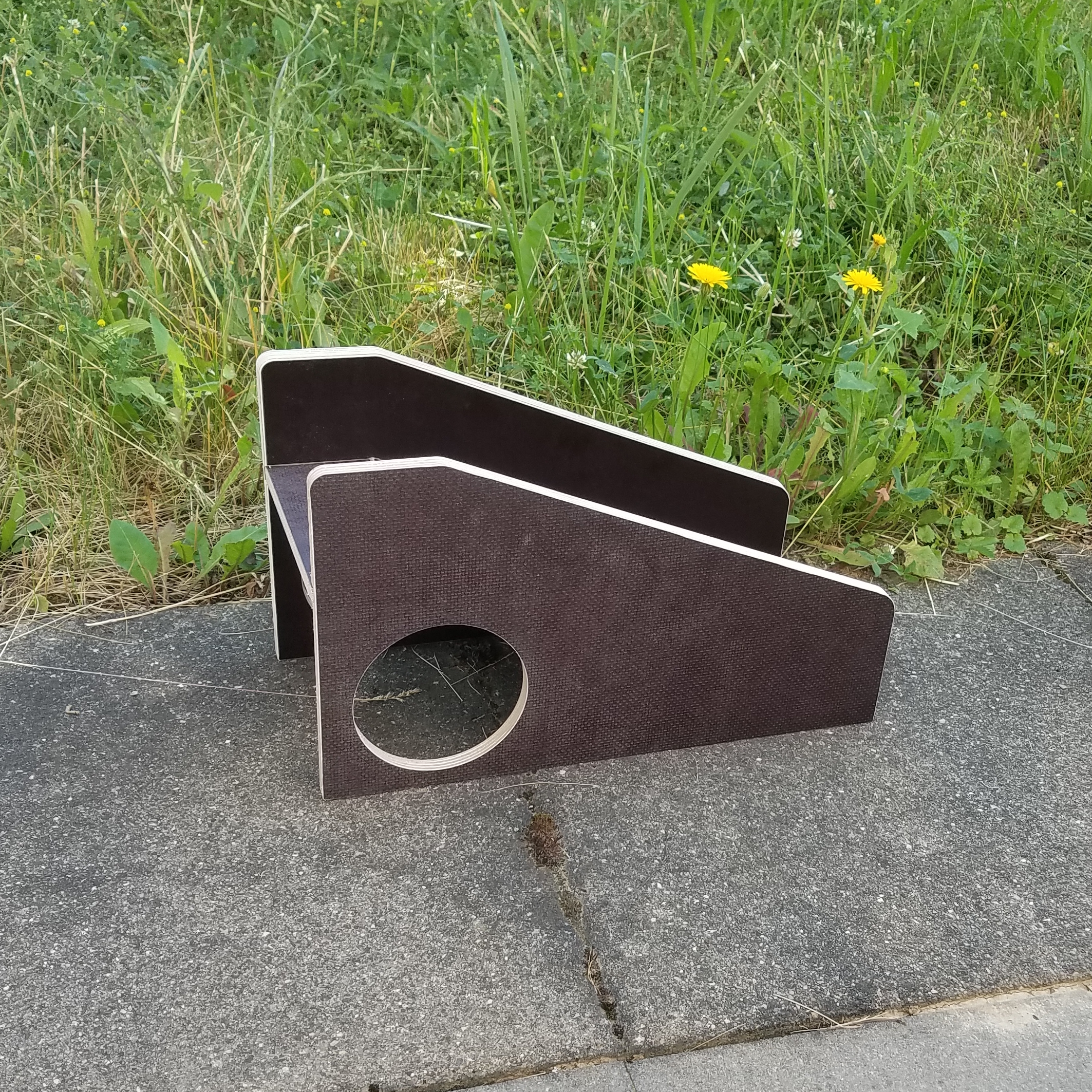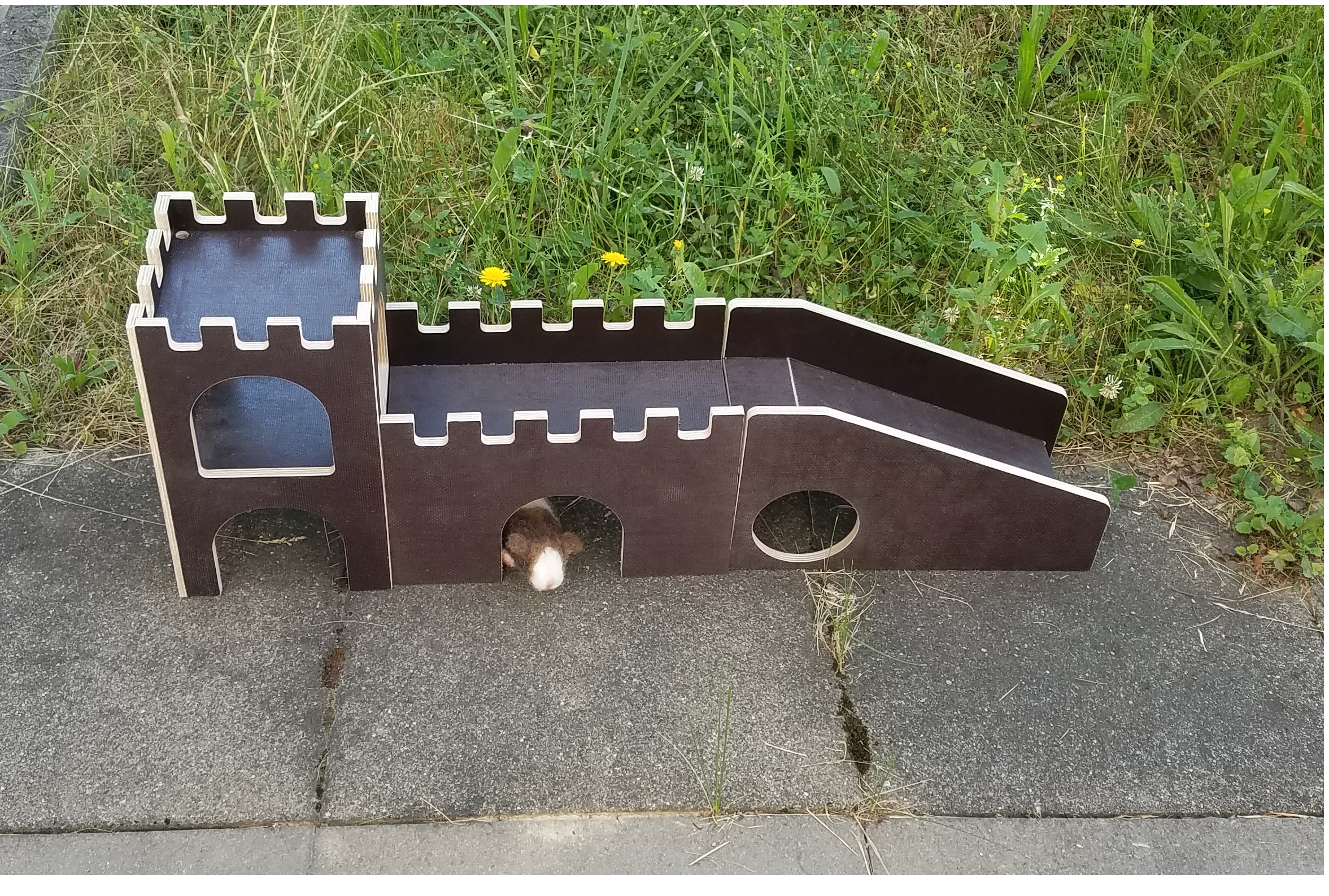 Zur wetterbeständigen Wutzenburg passende oder an Häuschen anstellbare Rampe. Passend zu sämtlichen wetterbeständigen Wehrgängen (Art.Nr.80104, 80131, 80132) und Türmen (Art.Nr.80103 und 80130). Die Rampe ist mit einer Steigung von 22,5° sehr bequem für Meerschweinchen zu begehen, die Brüstung zu beiden Seiten bietet auch unsicheren und älteren Tieren viel Sicherheit. Die Oberfläche ist angerauht und bietet so Halt beim Laufen. Die Rampe ist an der Vorderseite offen und hat zu beiden Seiten je einen Durchschlupf, so dass sie neben der Funktion als Rampe auch noch eine Versteckmöglichkeit mit mehreren Eingängen bietet, selbst wenn sie an eine Häuschenseite ohne Eingang gestellt wird. Aus wasserfest verleimtem Furniersperrholz, hergestellt in Deutschland. Oberflächenstruktur nach Vorrat.