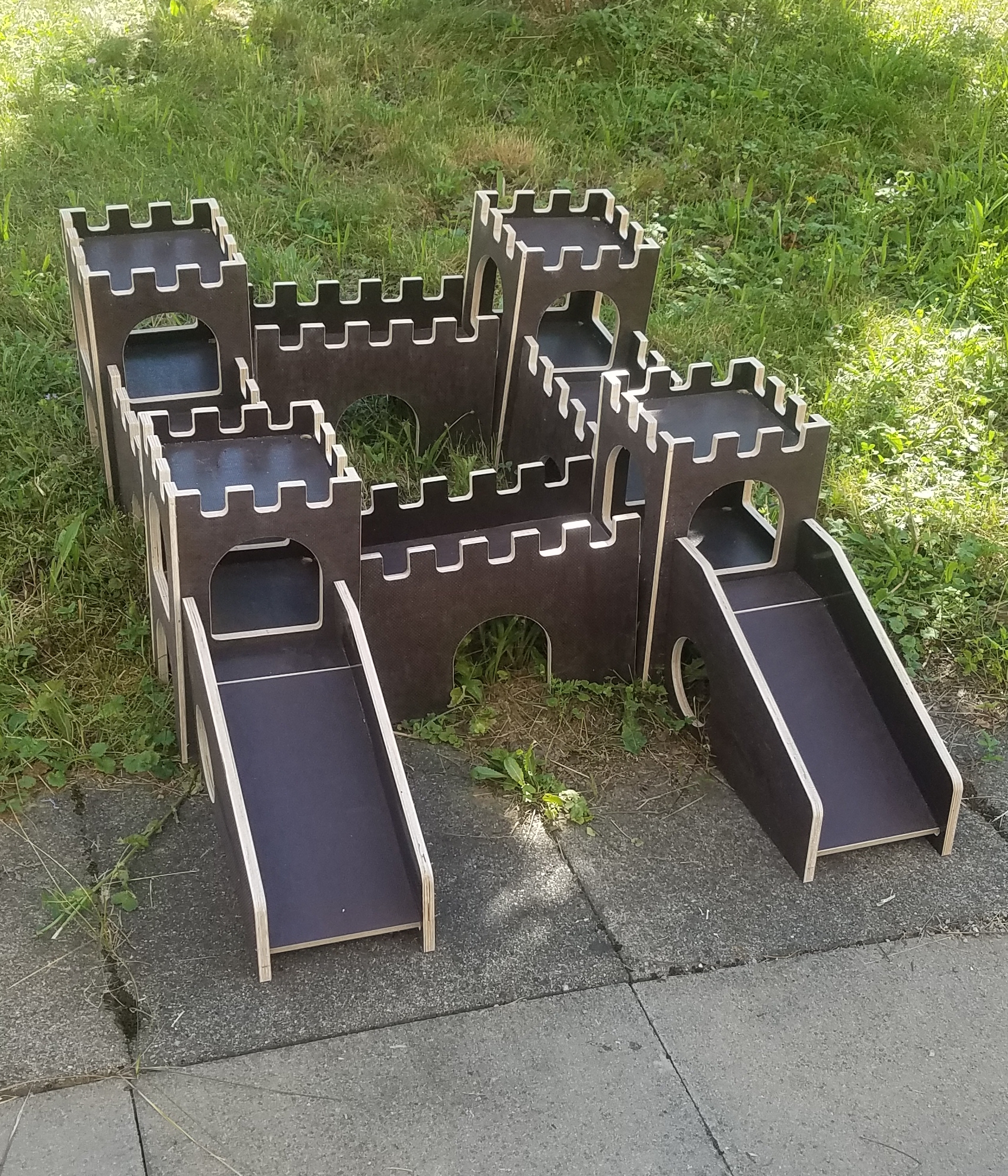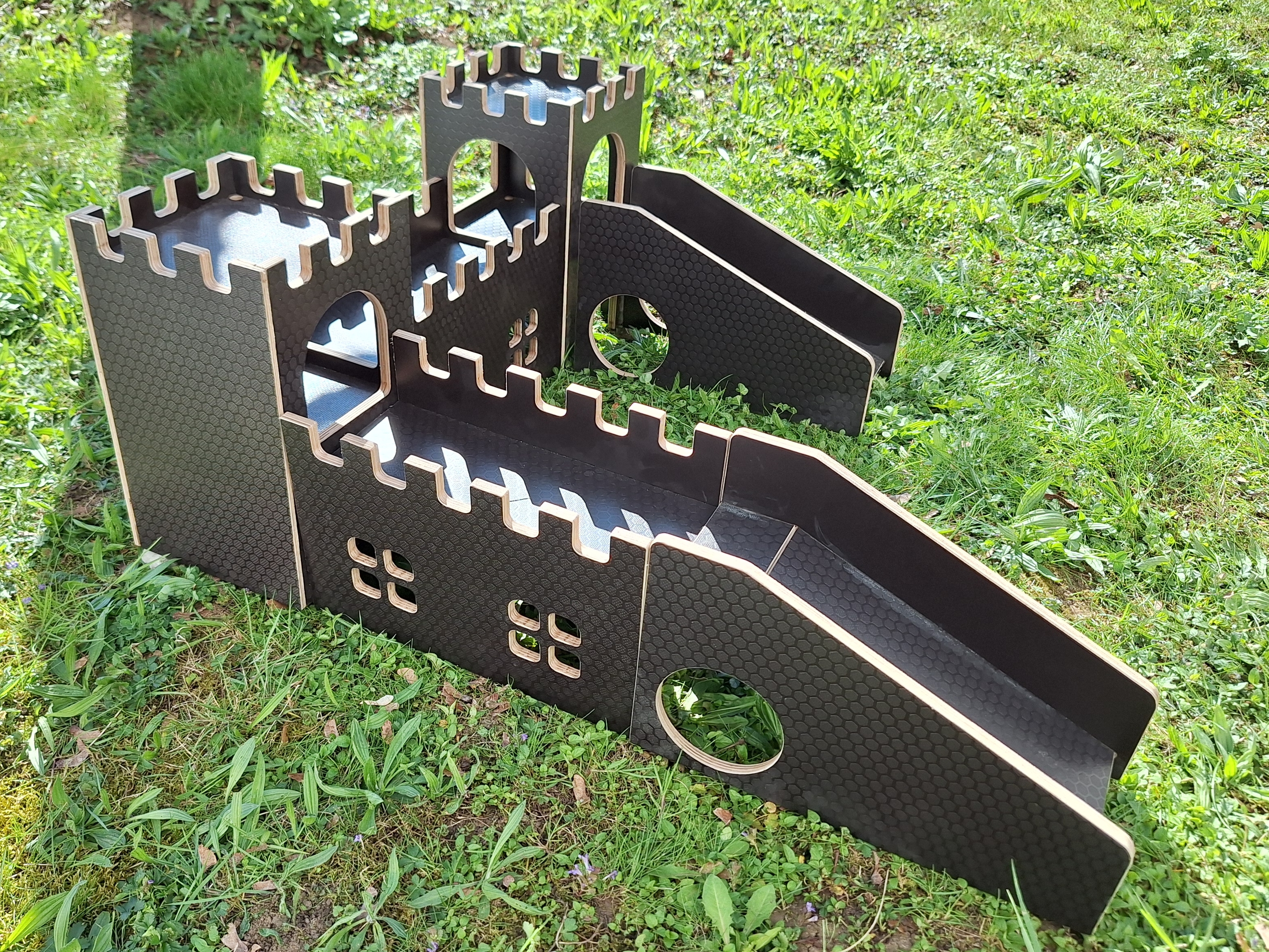 Wehrgang für die Wutzenburg. Der Wehrgang hat an beiden Längsseiten einen Eingang und ist an beiden Schmalseiten offen, so dass er mit dem Wutzenburg Burgturm wetterbeständig (Art.Nr.80103), den Wehrgängen mit Fenstern (Art.Nr. 80131, 80132), dem Burgturm wetterbeständig windgeschützt (Art.Nr. 80130) und der Rampe wetterbeständig (Art.Nr.80105) kombiniert werden kann. Hergestellt aus wasserfest verleimtem Furniersperrholz und in Deutschland. Oberflächenstruktur nach Vorrat. Lieferumfang: ein Wehrgang-Element ohne Meerschweinchen und Deko Maße: ca. 350x180x230mm, Durchgänge ca. 125x125mm, die Lauffläche befindet sich in ca.155mm Höhe und passt so genau zur oberen Ebene des Burgturmes.