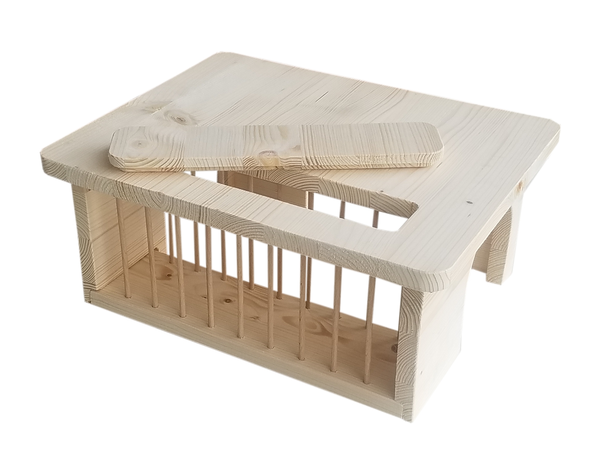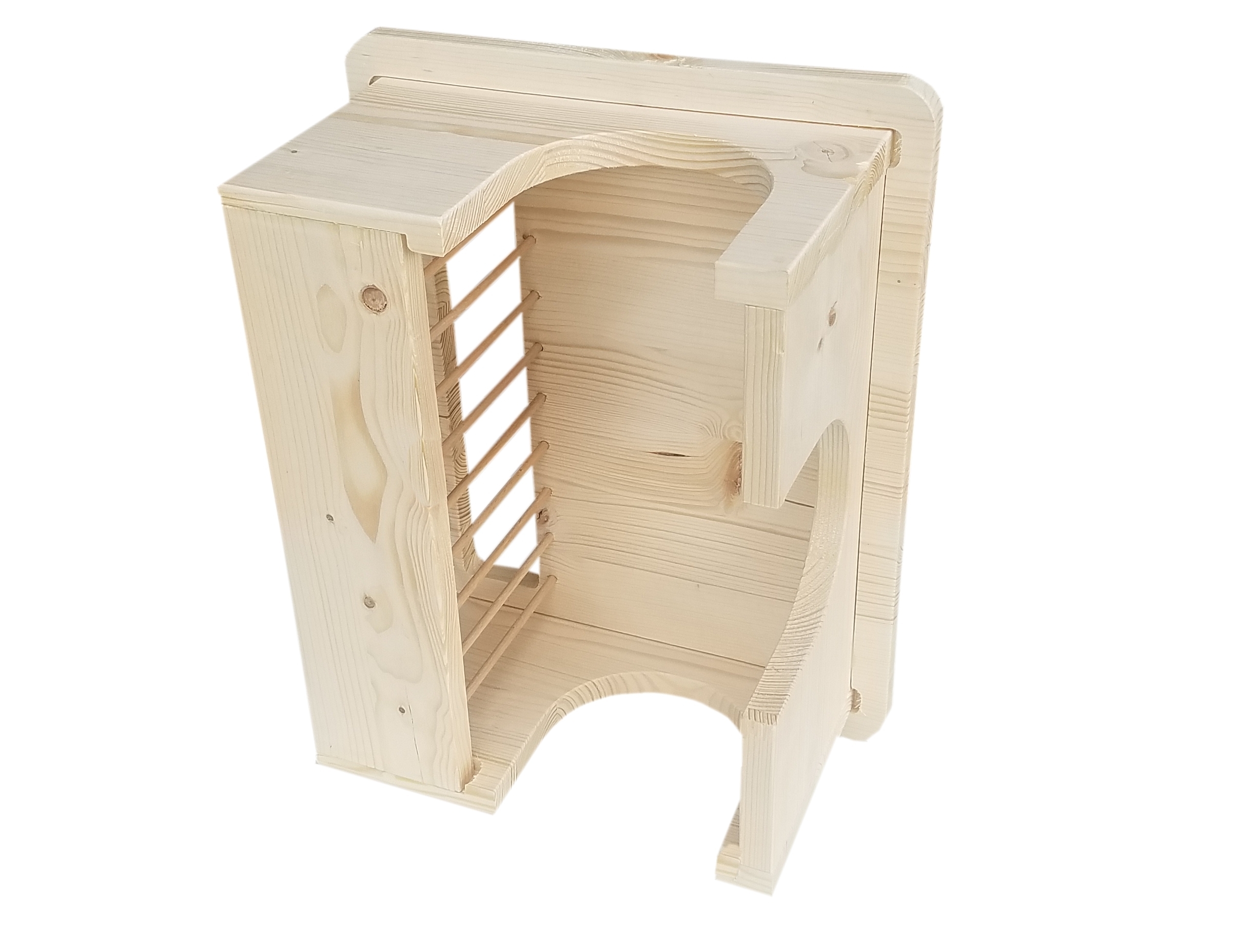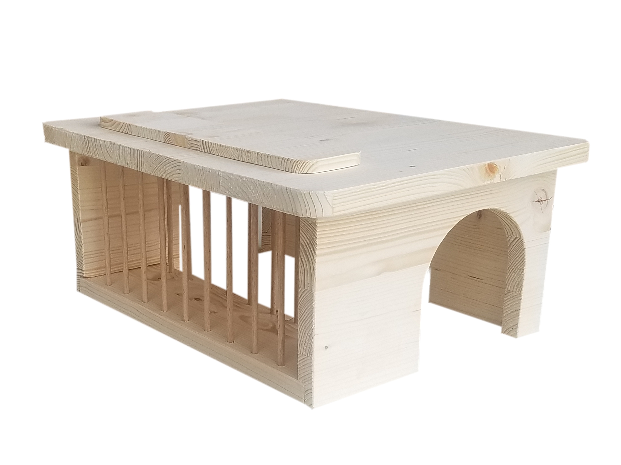 Meerschweinchenhäuschen mit integrierter, zweiseitig zugänglicher und einfach von oben befüllbarer Heuraufe. Ungestörtes Fressen auch für rangniedere Tiere. Sehr großes Fassungsvermögen. Mit drei Eingängen, abgerundeten Ecken. Aus naturbelassenem Fichtenleimholz. Hergestellt in Deutschland.