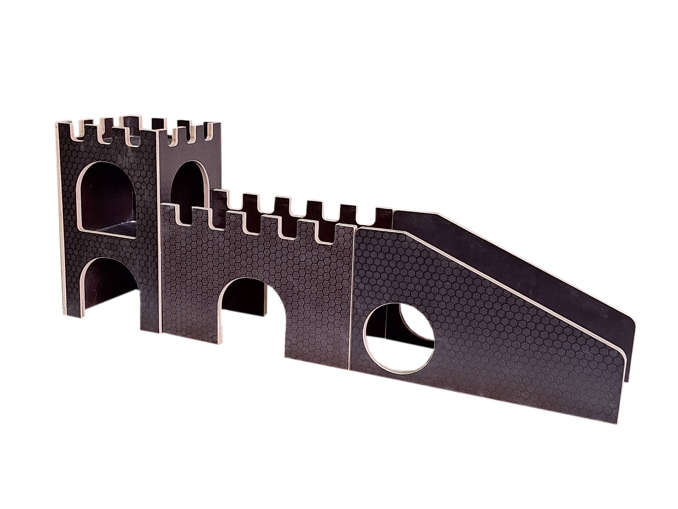 Wehrgang für die Wutzenburg. Der Wehrgang hat an beiden Längsseiten einen Eingang und ist an beiden Schmalseiten offen, so dass er mit dem Wutzenburg Burgturm wetterbeständig (Art.Nr.80103), den Wehrgängen mit Fenstern (Art.Nr. 80131, 80132), dem Burgturm wetterbeständig windgeschützt (Art.Nr. 80130) und der Rampe wetterbeständig (Art.Nr.80105) kombiniert werden kann.  Hergestellt aus wasserfest verleimtem Furniersperrholz und in Deutschland. Oberflächenstruktur nach Vorrat. Lieferumfang: ein Wehrgang-Element ohne Meerschweinchen und Deko Maße: ca. 350x180x230mm, Durchgänge ca. 125x125mm, die Lauffläche befindet sich in ca.155mm Höhe und passt so genau zur oberen Ebene des Burgturmes.