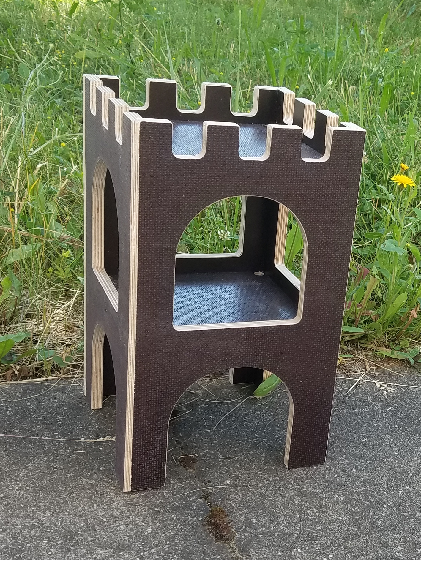 Der Turm ist wasserfest verleimt und hat in allen vier Ecken beider Ebenen Regenwasserabflüsse, damit kein Wasser stehen bleibt. Hergestellt in Deutschland aus wasserfest verleimtem Furniersperrholz. Oberflächenstruktur nach Vorrat.