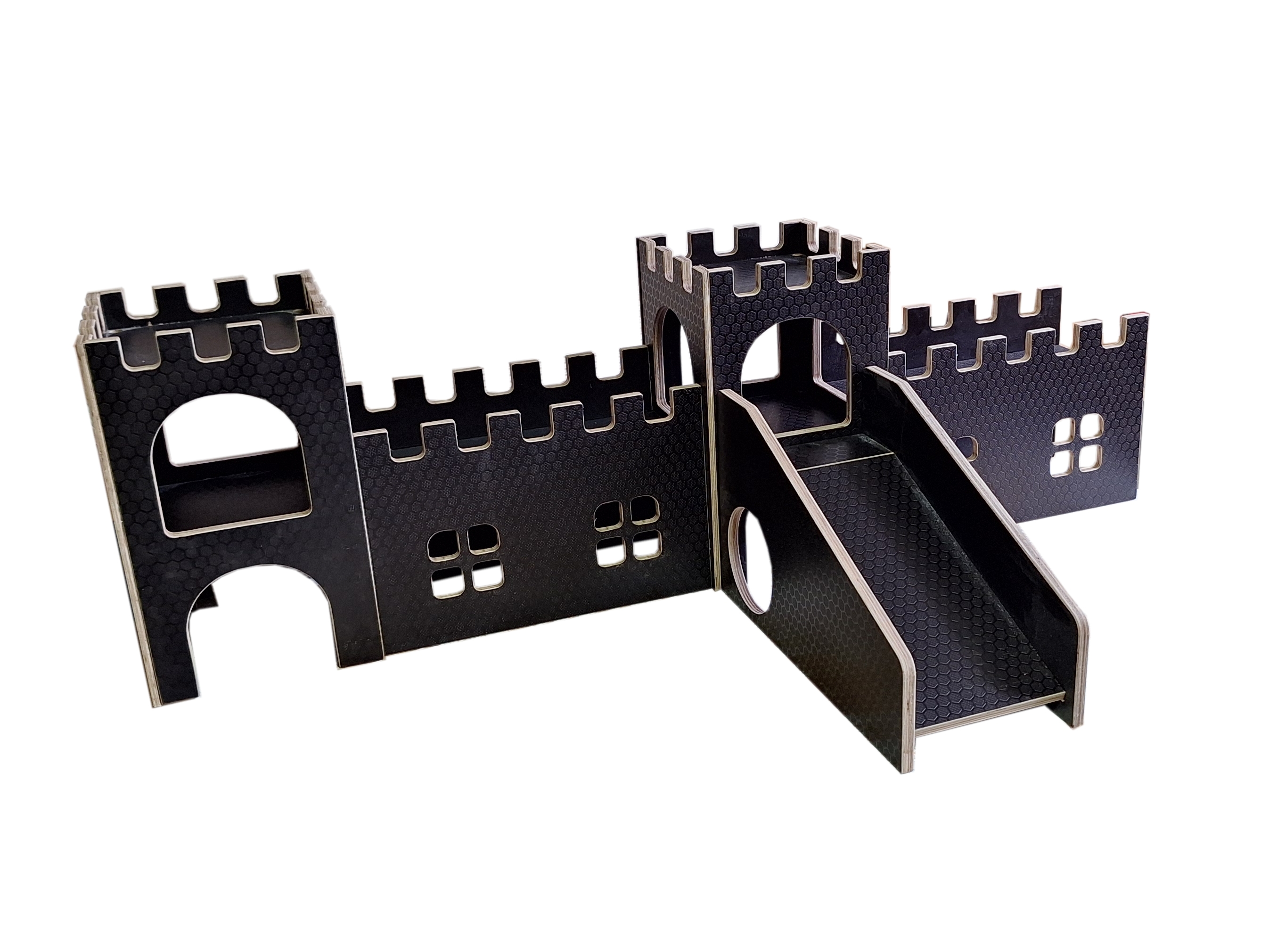 Wehrgang mit Fenstern für die wetterbeständige Wutzenburg. Der Wehrgang hat an einer Längsseite Fenster, die andere Längsseite ist komplett geschlossen. Beide Schmalseiten sind offen, so dass er mit dem Wutzenburg Burgturm wetterbeständig (Art.Nr.80103), dem Burgturm wetterbeständig windgeschützt (Art.Nr.80130), dem Wehrgang wetterbeständig (Art.Nr. 80104), dem Wehrgang mit Fenstern beidseitig wetterbeständig (Art.Nr. 80132) und der Rampe wetterbeständig (Art.Nr.80105) beliebig kombiniert werden kann. Hergestellt aus wasserfest verleimtem Furniersperrholz und in Deutschland. Oberflächenstruktur nach Vorrat. Lieferumfang: ein Wehrgang-Element ohne Meerschweinchen und Deko Maße: ca. 350x180x230mm, die Lauffläche befindet sich in ca.155mm Höhe und passt so genau zur oberen Ebene des Burgturmes.