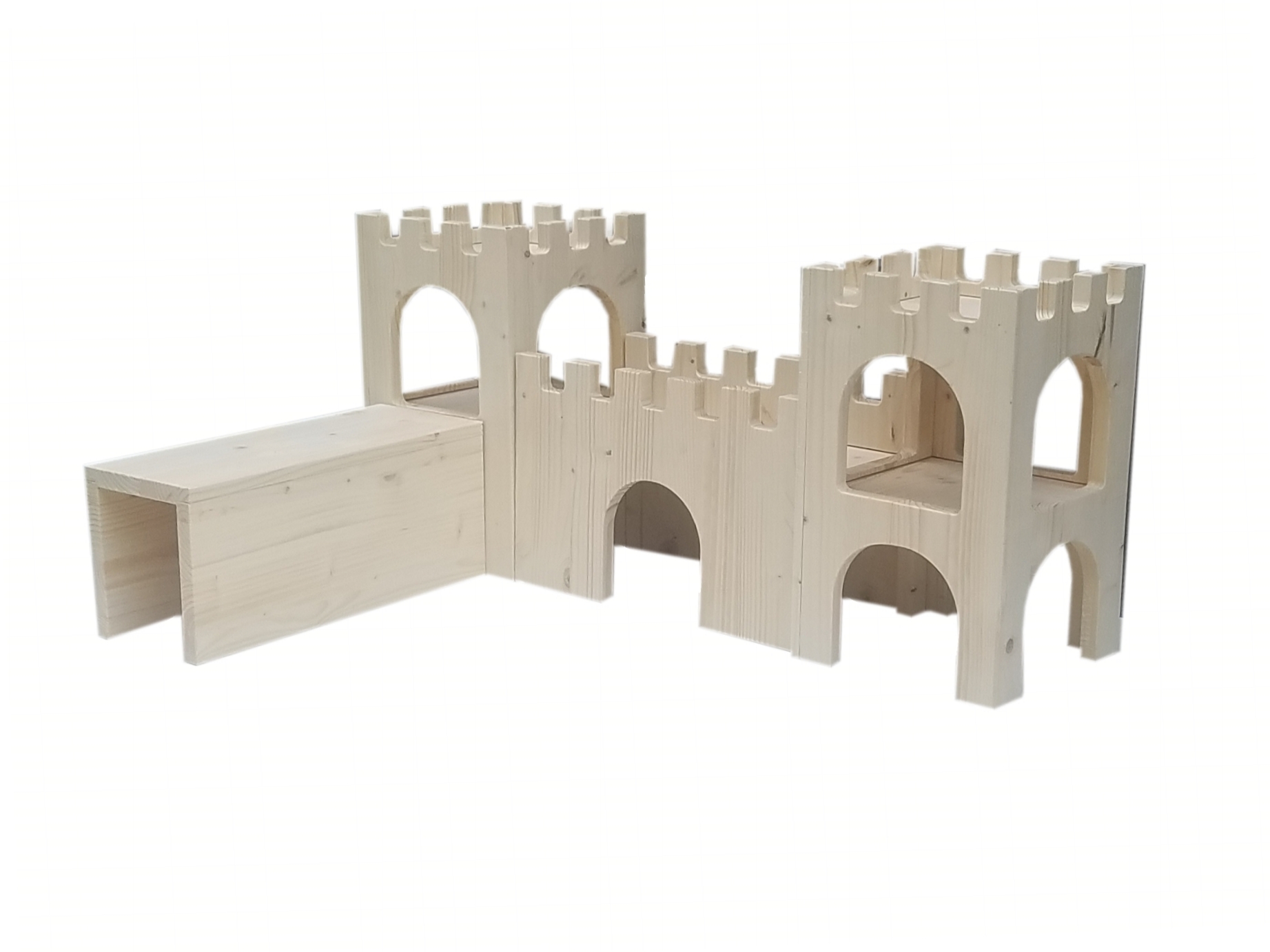 Brücke zum Einhängen für die Wutzenburg. Die Brücke passt mit ihren Zinnen ideal zur Wutzenburg und ist auf die Maße der Wehrgänge (Art. Nr. 80030, 80087,80097,80107) abgestimmt, so dass alle Teile nach Belieben kombiniert werden können. Sie kann in die Türme (Art.Nr.80029) eingehängt werden und hat so sicheren Halt, auch wenn schnelle Schweinchen darüber flitzen. Hergestellt aus Nadelleimholz und in Deutschland. Lieferumfang: ein Brücken-Element ohne Meerschweinchen und Deko Maße: ca. 420x180x120mm, die Lauffläche befindet sich in ca.155mm Höhe und passt so genau zur oberen Ebene des Burgturmes.